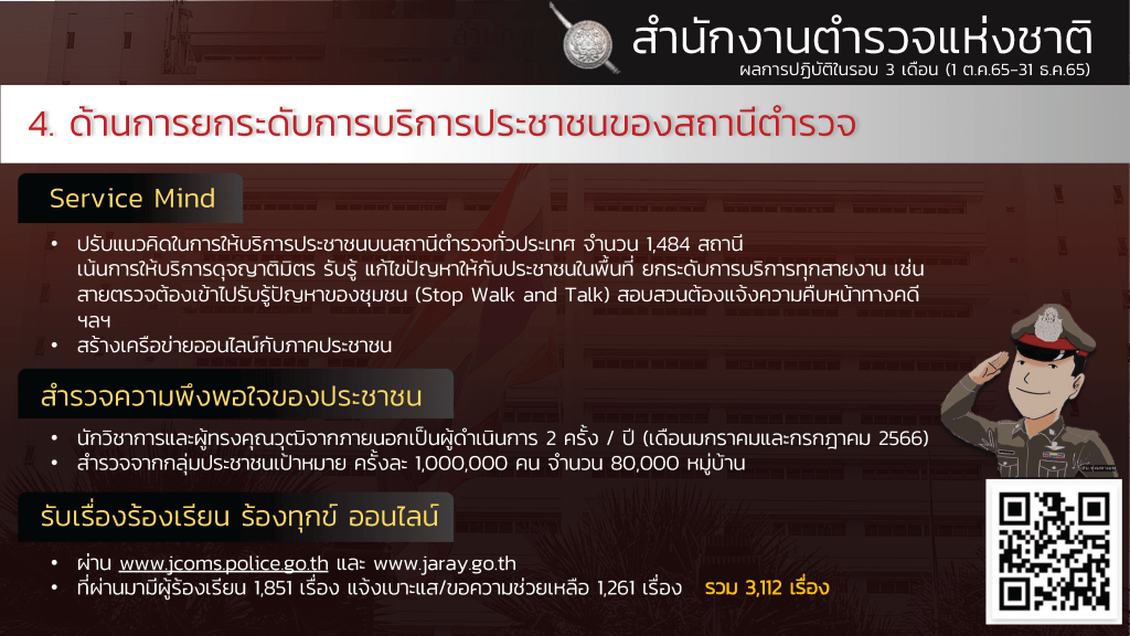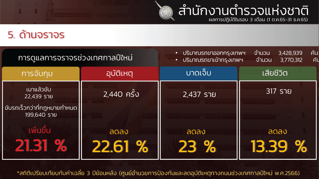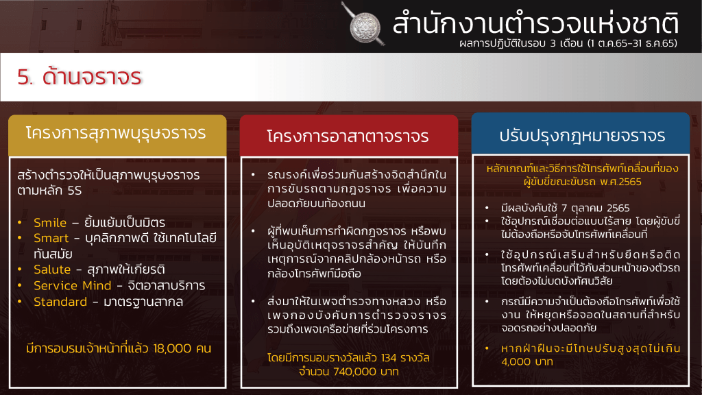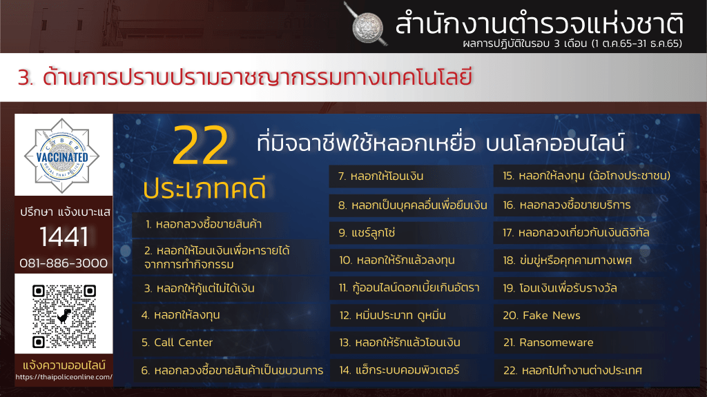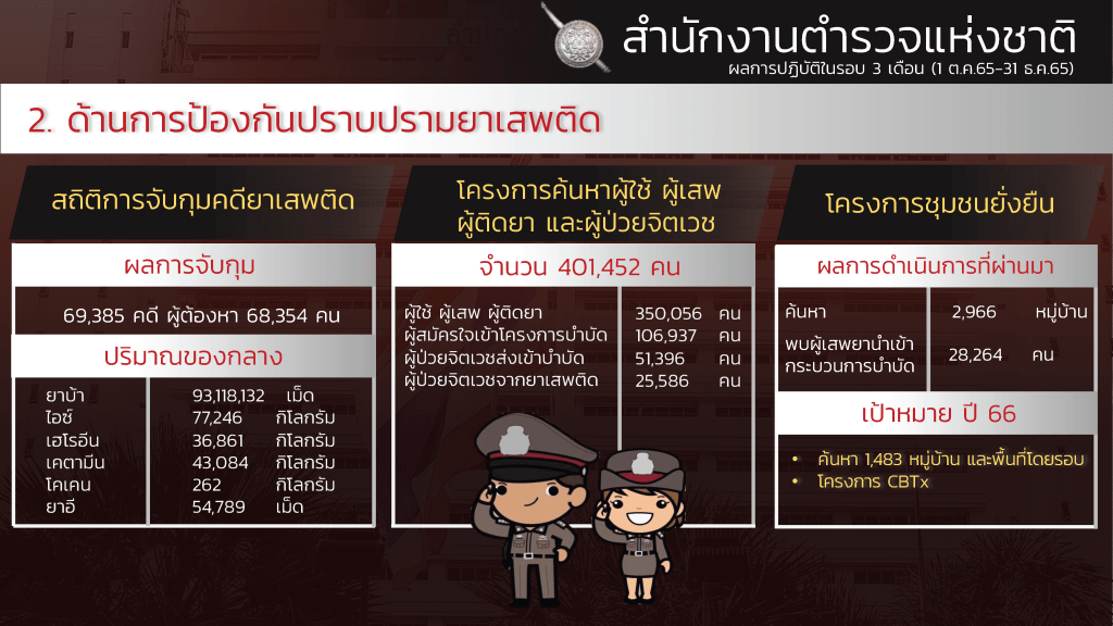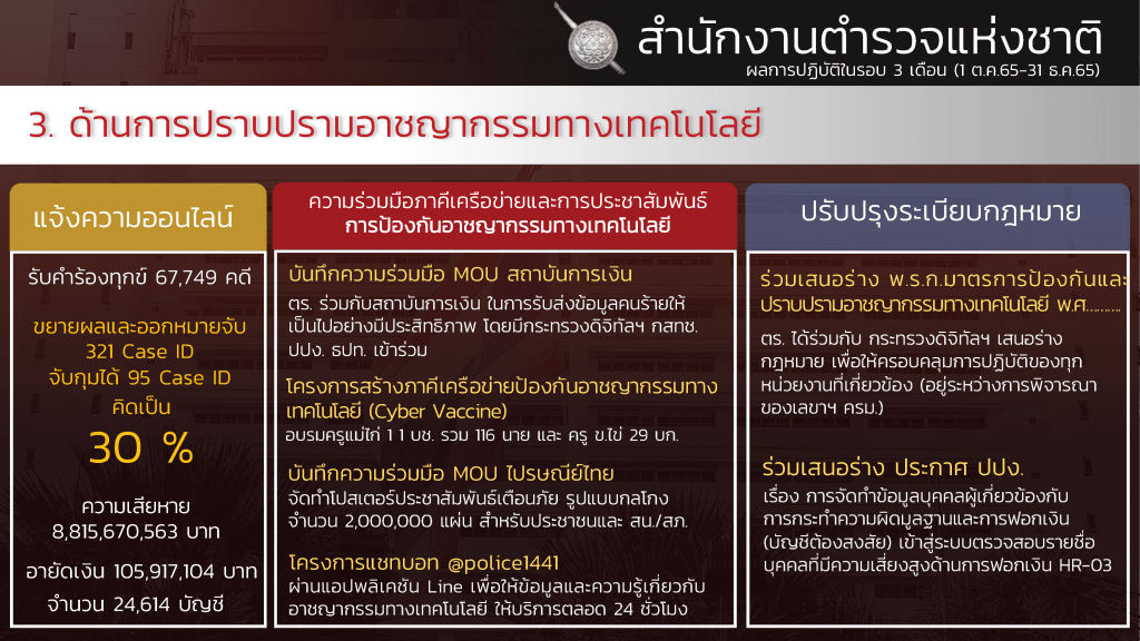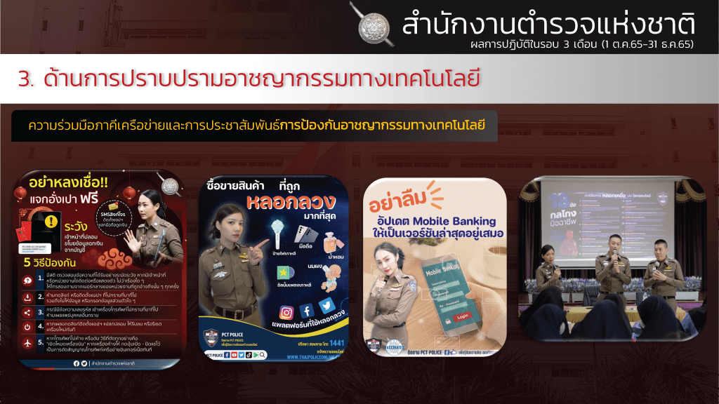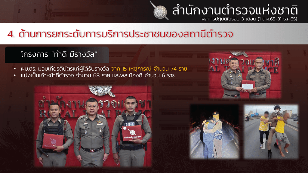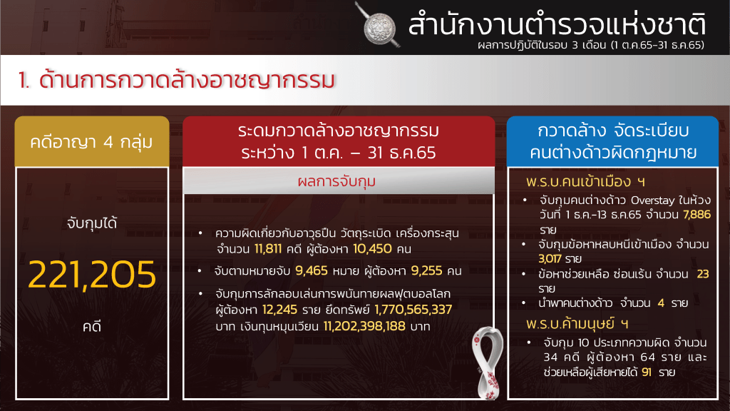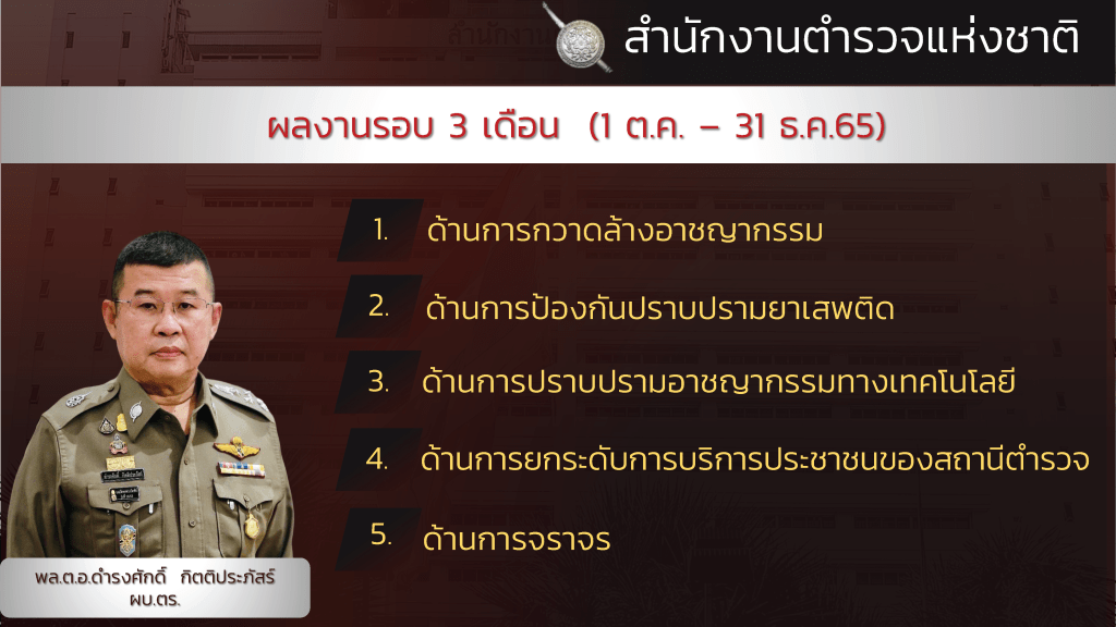 “ผลงานรอบ 3 เดือน ของสำนักงานตำรวจแห่งชาติ (1 ต.ค. – 31 ธ.ค. 65) ” “ขับเคลื่อนนโยบายรัฐบาล กวาดล้างอาชญากรรมอย่างเด็ดขาดและต่อเนื่อง สืบสวนปราบปรามจับกุม คดียาเสพติด คดีออนไลน์ การพนัน อาวุธปืนสถานบริการ เพิ่มความเข้มในการคัดกรองและจัดระเบียบคนต่างด้าวฯแก้ไขปัญหาและช่วยเหลือประชาชนในพื้นที่” แบ่งปันสิ่งนี้: แชร์บน X(เปิดในหน้าต่างใหม่) X แชร์บน Facebook(เปิดในหน้าต่างใหม่) เฟซบุ๊ค ถูกใจ กำลังโหลด... ที่เกี่ยวข้อง ใส่ความเห็น ยกเลิกการตอบ Δ