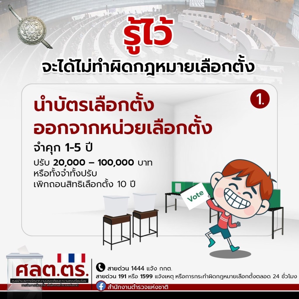 อย่างไรก็ตามหากท่านพบเห็นการกระทำความผิดกฎหมายเลือกตั้ง สามารถแจ้งตำรวจได้ที่สถานีตำรวจนครบาล สถานีตำรวจภูธรทุกแห่ง หรือ โทร.191 หรือ 1599 ได้ตลอด 24 ชั่วโมง หรือ แจ้งสายด่วน กกต. 1444