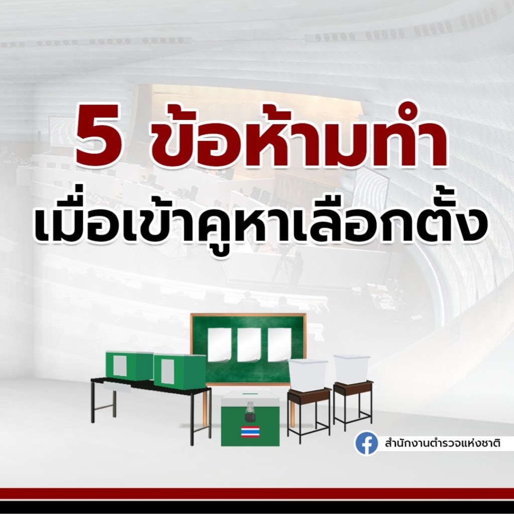พล.ต.ท.นิธิธร จินตกานนท์ ผู้บัญชาการประจำสำนักงาน ผบ.ตร. ทำหน้าที่ โฆษก ศลต.ตร. ขอประชาสัมพันธ์แจ้งเตือนประชาชนที่จะไปใช้สิทธิเลือกตั้งสมาชิกสภาผู้แทนราษฎรล่วงหน้า ในวันอาทิตย์ที่ 7 พฤษภาคม 2566 ให้ระมัดระวังการกระทำผิดกฎหมายเกี่ยวกับการเลือกตั้ง 5 ข้อ ดังนี้