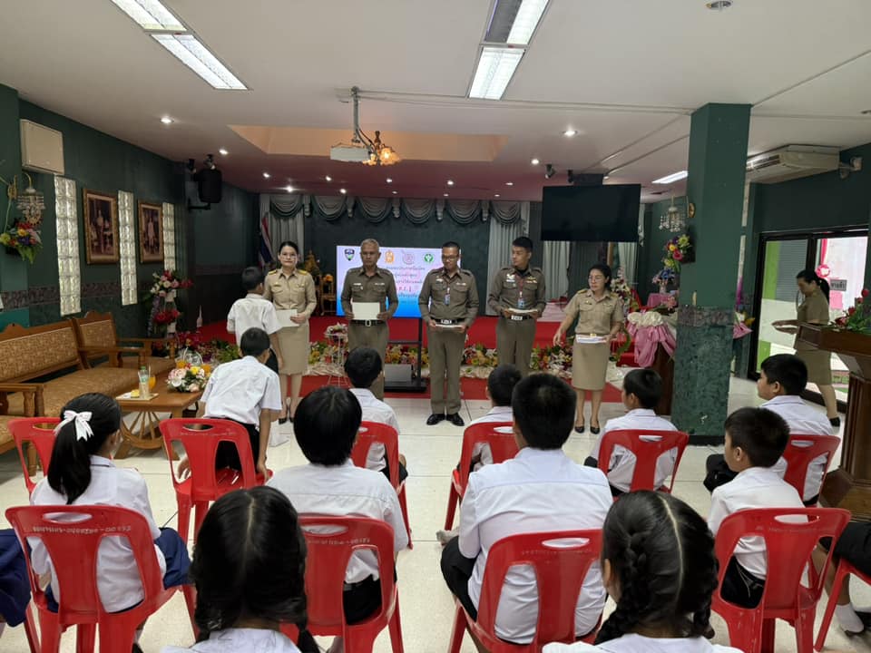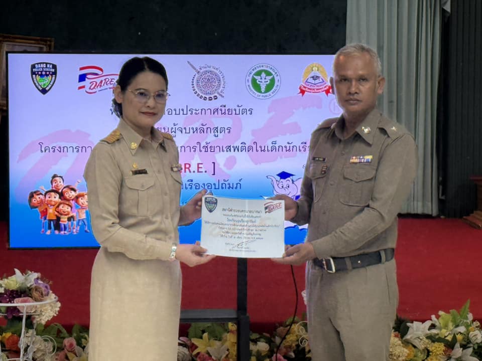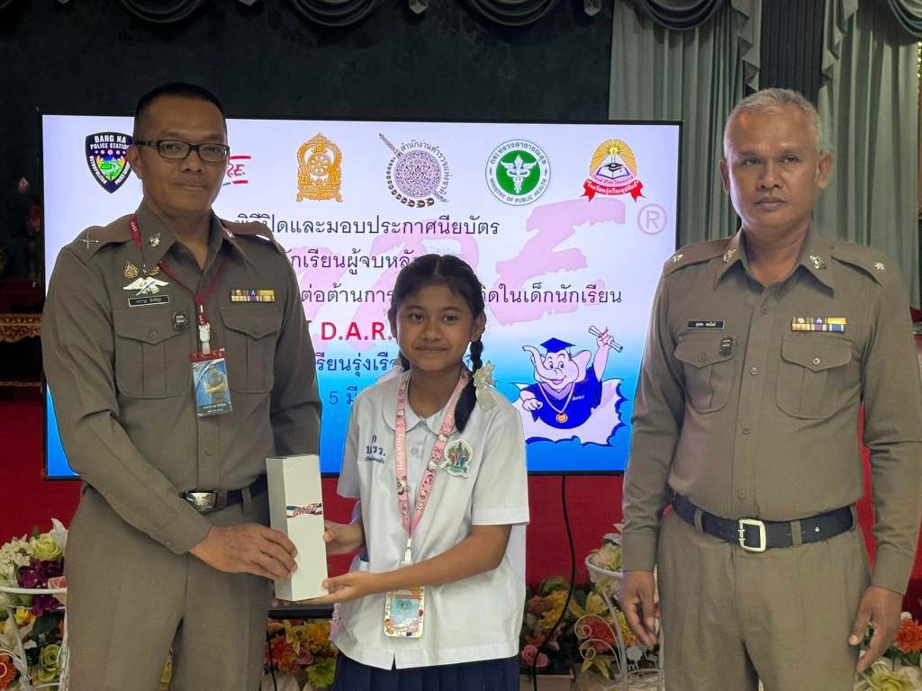 มอบใบประกาศนียบัตรให้แก่นักเรียน ชั้นประถมศึกษาปีที่ 5 ที่ผ่านการอบรมจบหลักสูตรตามโครงการการศึกษาเพื่อต่อต้านการใช้ยาเสพติดในเด็กนักเรียน (D.A.R.E.) ประเทศไทย ของสำนักงานตำรวจแห่งชาติ