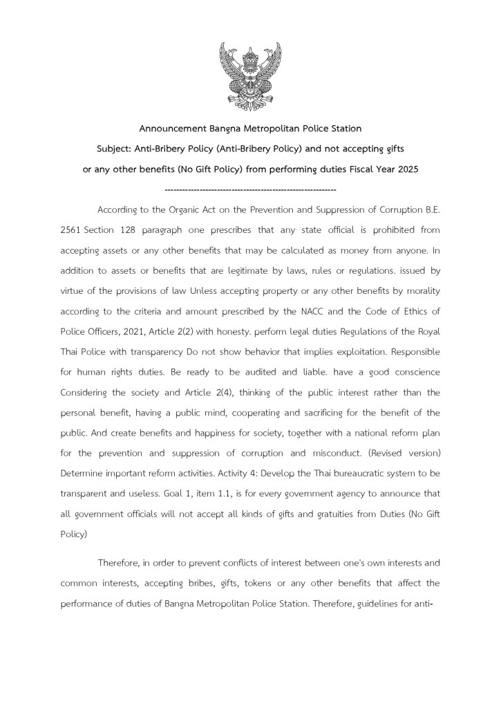 ประกาศ สถานีตำรวจนครบาลบางนา เรื่อง นโยบายต่อต้านการรับสินบน (Anti-Bribery Policy) และการไม่รับของขวัญของกำนัล หรือประโยชน์อื่นใด (No Gift Policy) จากการปฏิบัติหน้าที่ ประจำปีงบประมาณ พ.ศ. 2568 แบ่งปันสิ่งนี้: แชร์บน X(เปิดในหน้าต่างใหม่) X แชร์บน Facebook(เปิดในหน้าต่างใหม่) เฟซบุ๊ค ถูกใจ กำลังโหลด... ที่เกี่ยวข้อง ใส่ความเห็น ยกเลิกการตอบ Δ