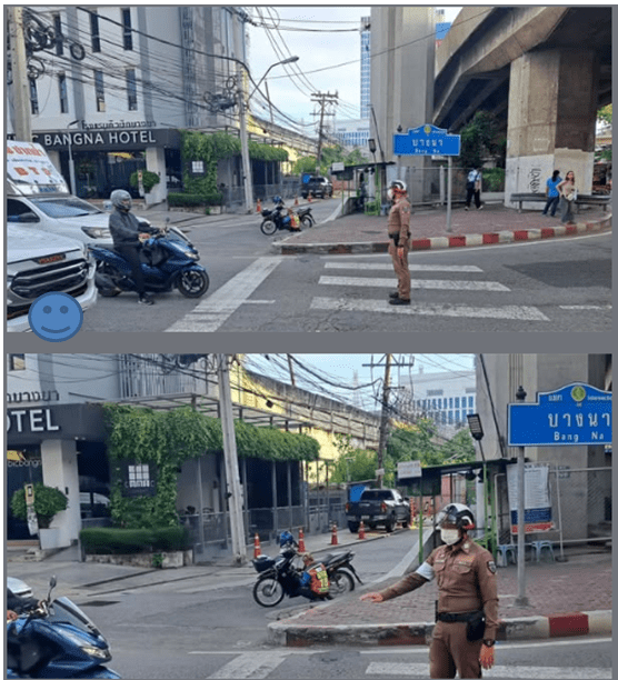 พร้อมด้วย เจ้าหน้าที่ตำรวจจราจร สน.บางนา กวดขันวินัยจราจร รณรงค์ และประชาชาสัมพันธ์ผู้ขับขี่รถจักรยานยนต์ รถยนต์ไม่จอดล้ำแนว บริเวณแยกบางนา