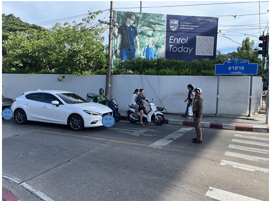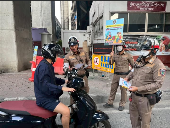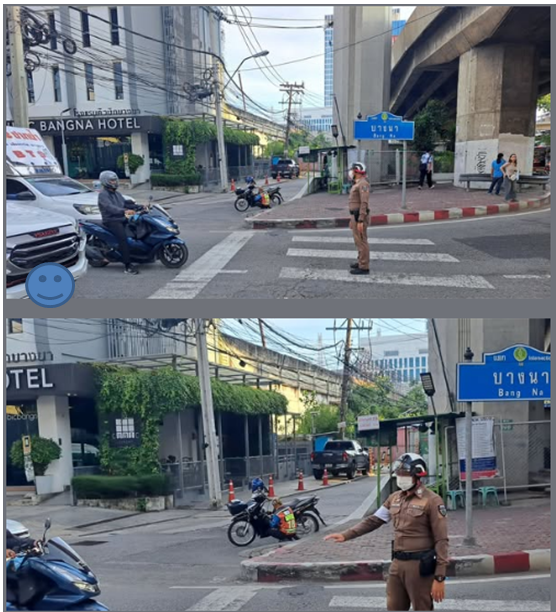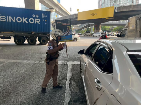 กวดขันวินัยจราจร รณรงค์ และประชาชาสัมพันธ์ผู้ขับขี่รถจักรยานยนต์ รถยนต์ไม่จอดล้ำแนว บริเวณแยกลาซาล..